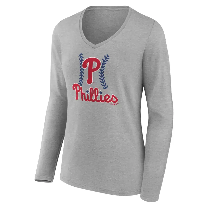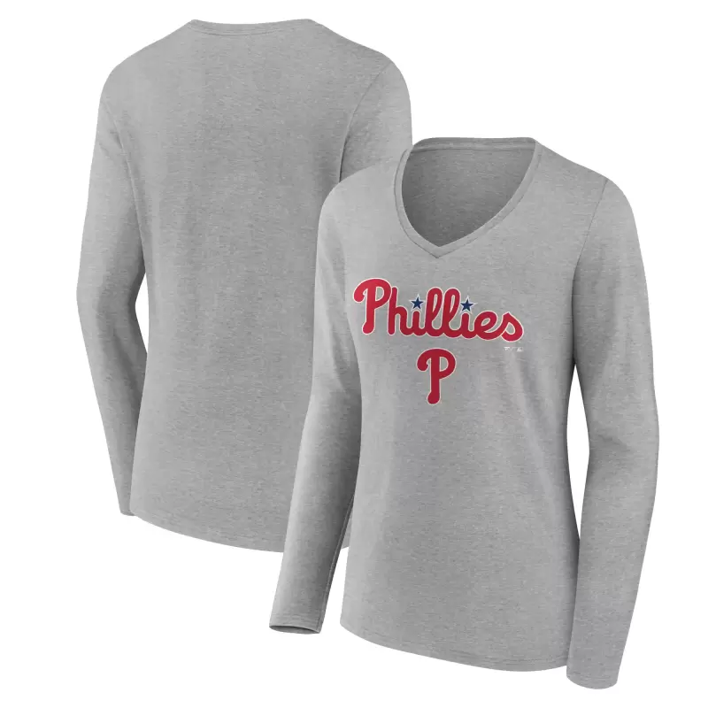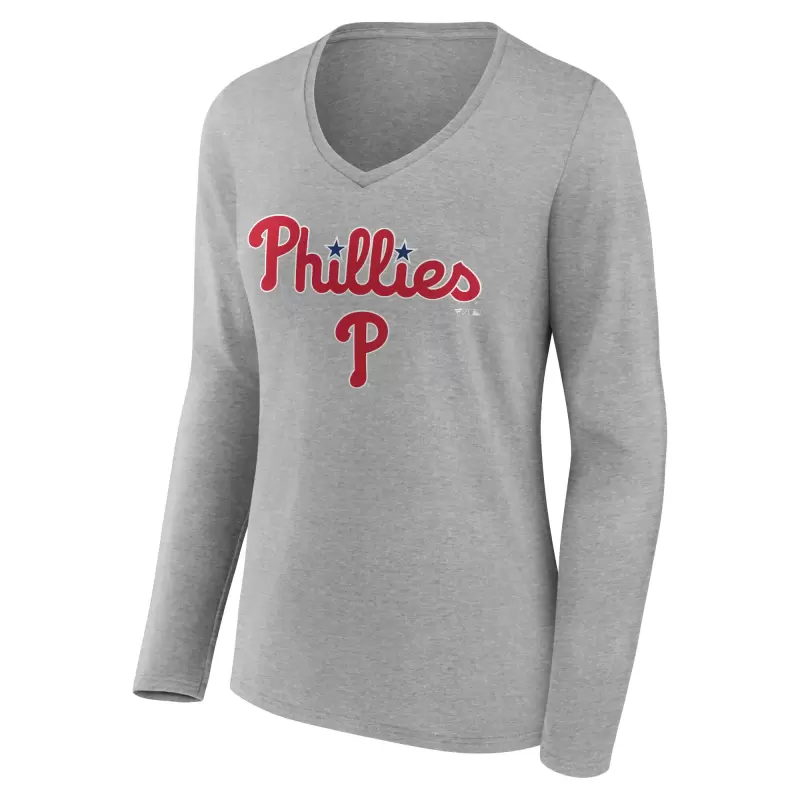 Women’s Philadelphia Phillies Gray Team Lockup Long Sleeve V-Neck T-Shirt