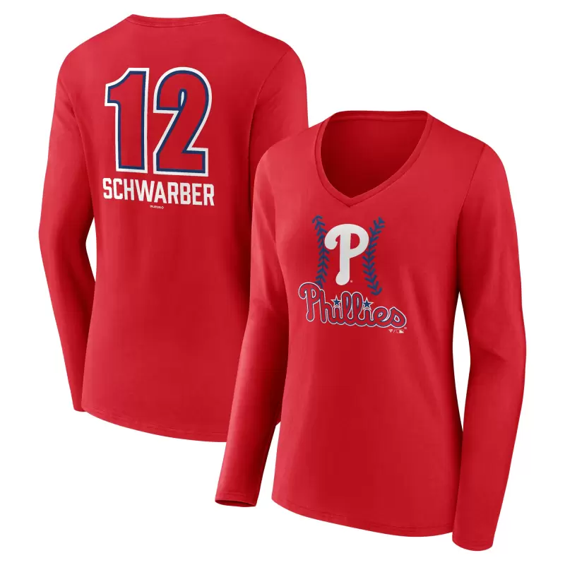 Women’s Philadelphia Phillies Kyle Schwarber Red Fastball Player Name & Number Long Sleeve V-Neck T-Shirt