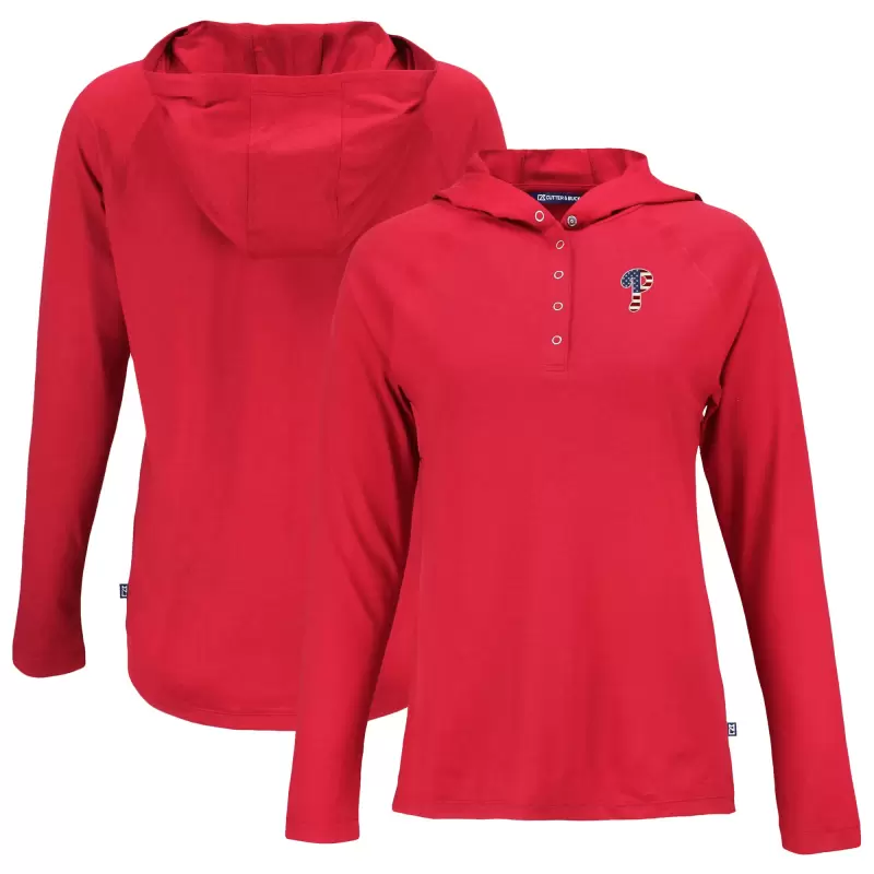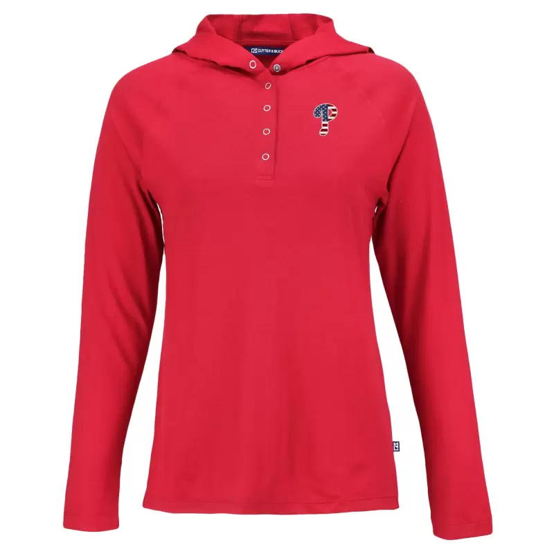 Women’s Philadelphia Phillies Cutter & Buck Red Stars And Stripes Coastline Epic Comfort Eco Recycled Hoodie Raglan Long Sleeve T-Shirt