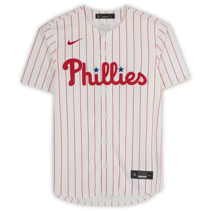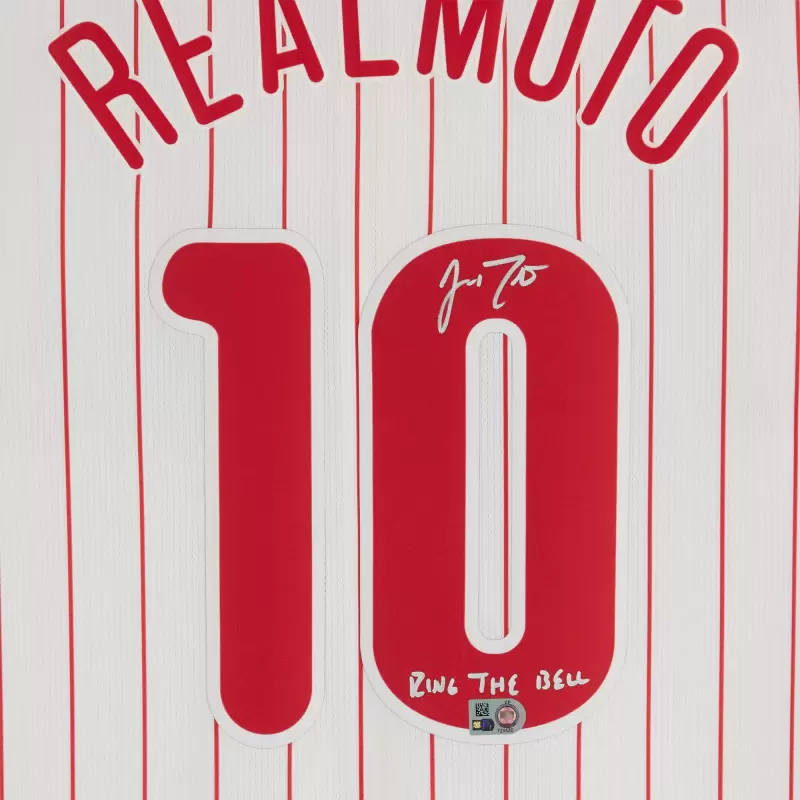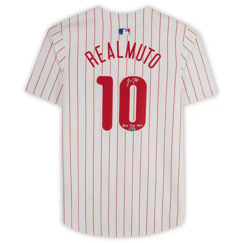 Celebrate the Philadelphia Phillies’ star catcher with this J.T. Realmuto Autographed White Nike Limited Jersey with “Ring the Bell” Inscription. This official piece of gear has been personally hand-signed by the Phillies star catcher and includes an inscription that reads “Ring the Bell”. This jersey also comes with an individually numbered, tamper-evident hologram that can be verified online to certify authenticity.