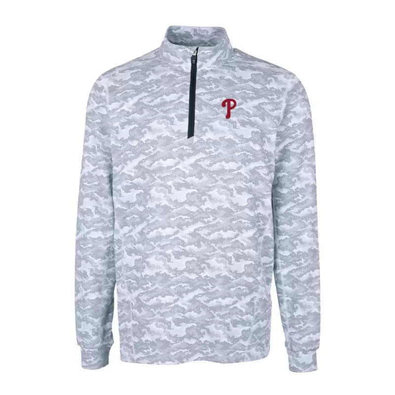 Represent your Philadelphia Phillies pride with this Cutter & Buck Big & Tall Traverse Camo Print Stretch Quarter-Zip Pullover Top. This quarter-zip pullover features a stylish all-over camo design and reflective tape trim on the zipper bottom. The embroidered Philadelphia Phillies logo on the left chest proudly displays your team spirit. Whether you’re at Citizens Bank Park or watching from home, this pullover will keep you comfortable and stylish while you cheer on the Phillies.