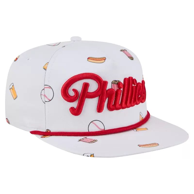 Show your Philadelphia Phillies pride with this Team Cheer Rope 19TWENTY Adjustable Hat from New Era. The 19TWENTY offers a relaxed fit crown with pinched front panel construction, giving it that sought-after vintage vibe. The Philadelphia Phillies graphics embroidered across the front, all-over printed graphics and braided rope on the top visor add bold and stylish details to this throwback design.