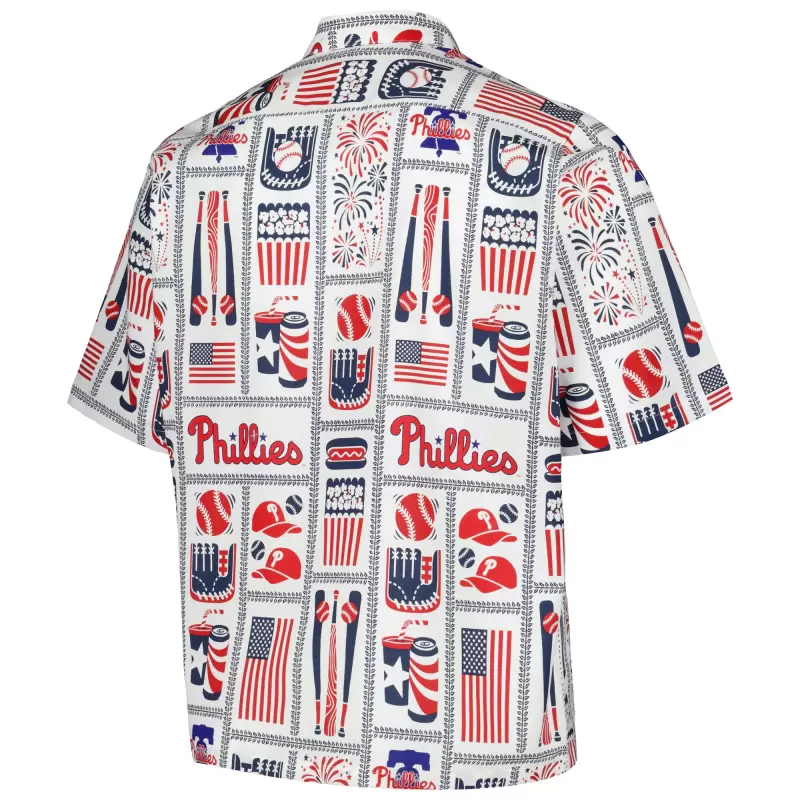 The Reyn Spooner White Philadelphia Phillies Americana Button-Up Shirt is the perfect way to show your support for the Philadelphia Phillies. This stylish shirt features an allover printed design with the Phillies logo prominently displayed on the front chest pocket. Made from soft and comfortable cotton, this shirt is perfect for any occasion, whether you’re cheering on the Phillies at the game or just relaxing at home.