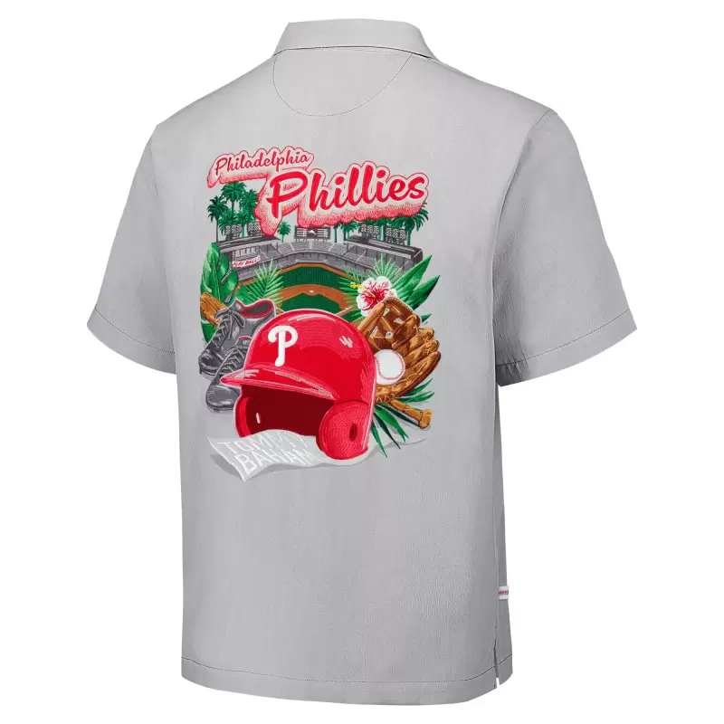 Indulge in the ultimate fan experience with this Philadelphia Phillies Hit and Run Silk Shirt from Tommy Bahama. This short sleeve, full-button-up is crafted from luxurious 100% silk for a comfortably breezy feel. Its woven design features an embroidered team logo on the left chest and graphics on the back that depict the Philadelphia Phillies in stadium paradise.