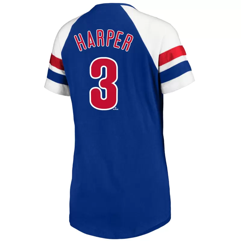 Celebrate your Philadelphia Phillies fandom with this Bryce Harper Plus Size Name & Number Raglan T-Shirt from Profile. This plus-size T-shirt features raglan sleeves for greater freedom of movement in the shoulders and arms, making it perfect for active wear or cheering on your favorite player. Plus, the screen-printed team graphics on the front and player name and number on the back allow you to show your Philadelphia Phillies pride in style.