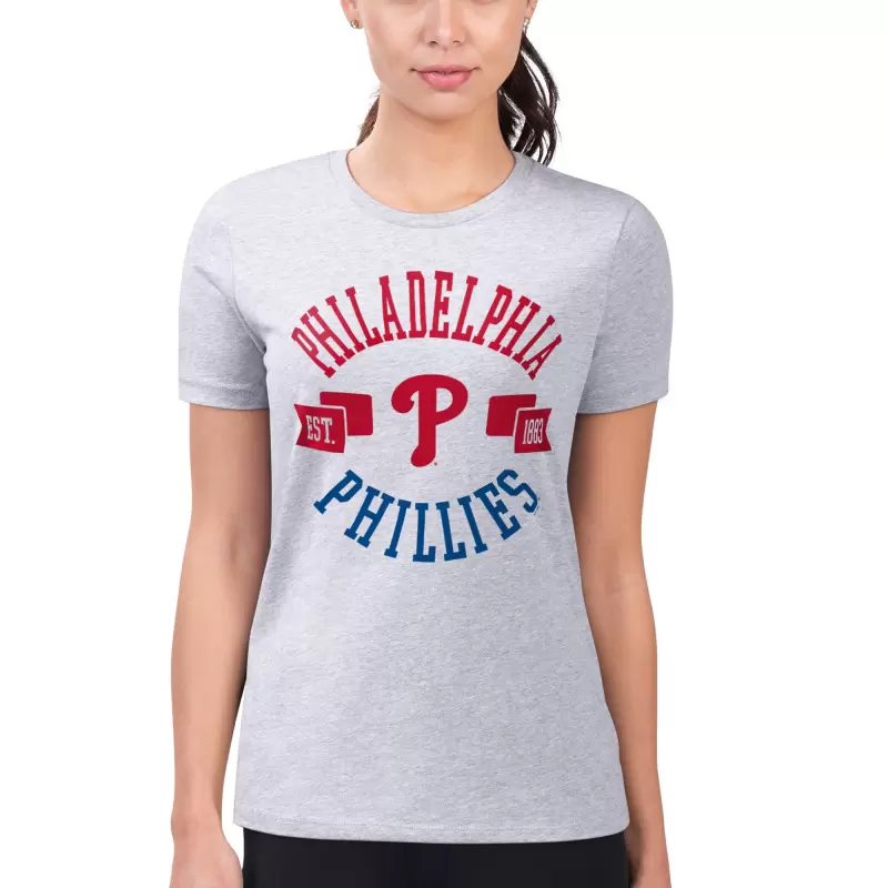 The Women’s G-III 4Her by Carl Banks Heather Gray Philadelphia Phillies City Graphic Fitted T-shirt is the perfect way to show unwavering support for the Philadelphia Phillies. Made from a comfortable cotton and polyester blend, this fitted T-shirt features screen print graphics that proudly display team pride. Whether cheering from the stands or showing support, this T-shirt is the perfect way to represent the Philadelphia Phillies in style.