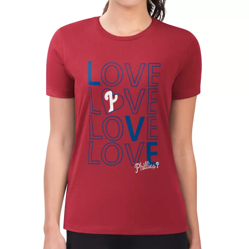 The Women’s G-III 4Her by Carl Banks Red Philadelphia Phillies Love Graphic Team Fitted T-shirt is the perfect way to show unwavering support for the Philadelphia Phillies. Made from a soft and comfortable combed ring-spun cotton and polyester blend, this fitted T-shirt features vibrant screen print graphics that proudly display team spirit. Whether cheering from the stands or expressing love for the Phillies, this T-shirt is a must-have for any true fan.