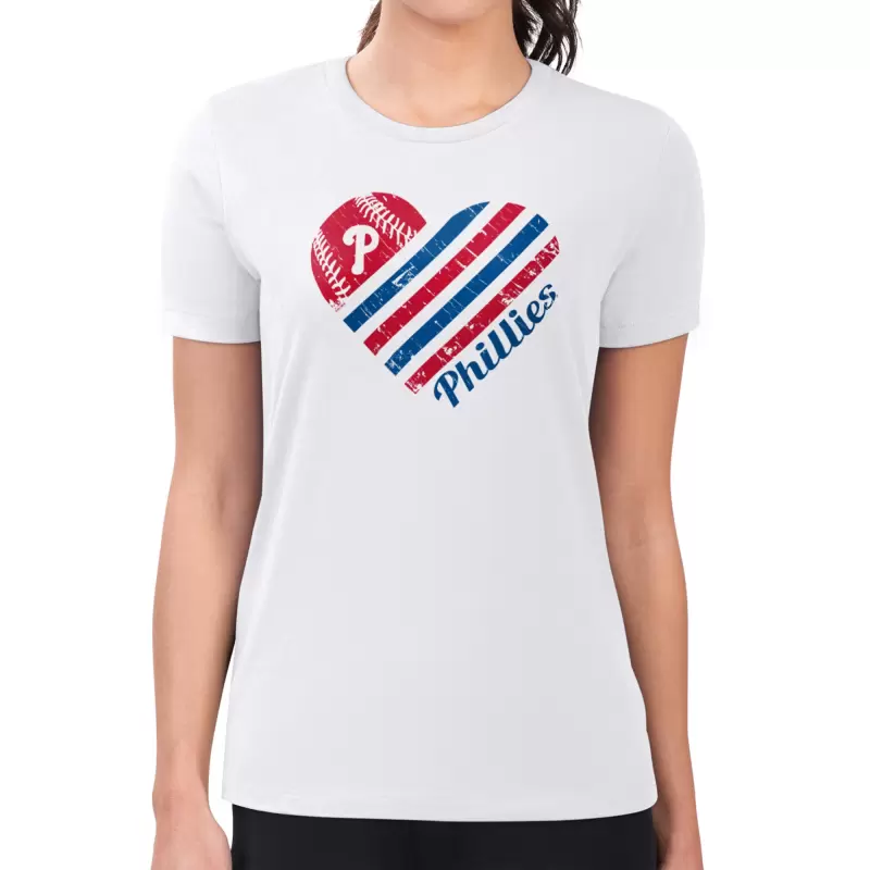 Celebrate your unwavering Philadelphia Phillies fandom with the Women’s G-III 4Her by Carl Banks White Philadelphia Phillies Heart Graphic Fitted T-Shirt. This stylish tee features screen print graphics that proudly display your love for the Phillies. Made from a comfortable cotton and polyester blend, it’s perfect for game days or any day you want to show your support for the team.
