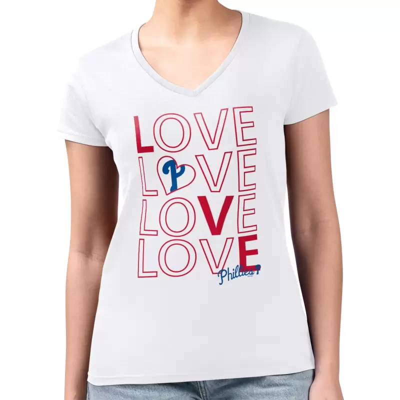 Celebrate your unwavering Philadelphia Phillies fandom with the Women’s G-III 4Her by Carl Banks White Philadelphia Phillies Love Graphic Team V-Neck Fitted T-Shirt. This stylish tee features screen-print graphics that proudly display your love for the Phillies. Made from a comfortable combed ring-spun cotton and polyester blend, it’s perfect for game day or any day you want to show your support for the Philadelphia Phillies.